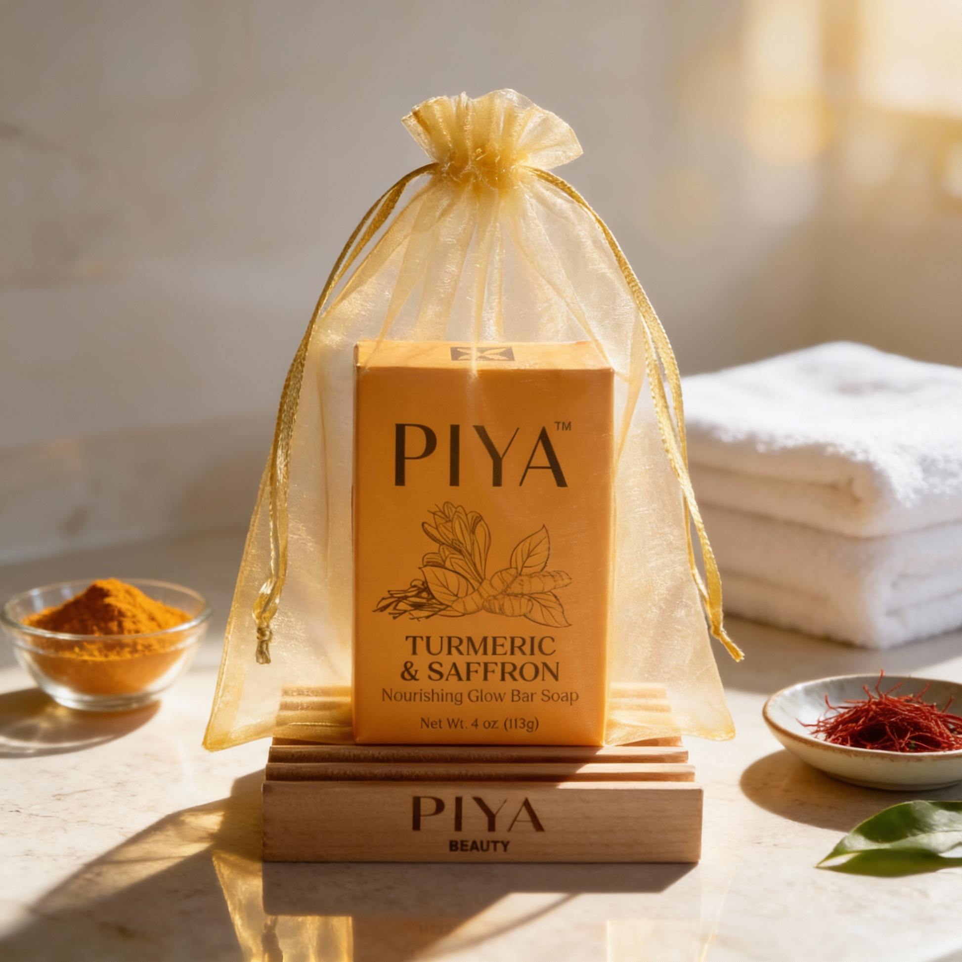 Each set includes one of our handcrafted PIYA beauty bars, made with natural and organic ingredients and infused with our signature, soothing scents. Paired with a sustainable wooden soap dish to help extend the life of the soap, this gift is beautifully packaged in an elegant golden organza bag—ready to gift, no wrapping required.